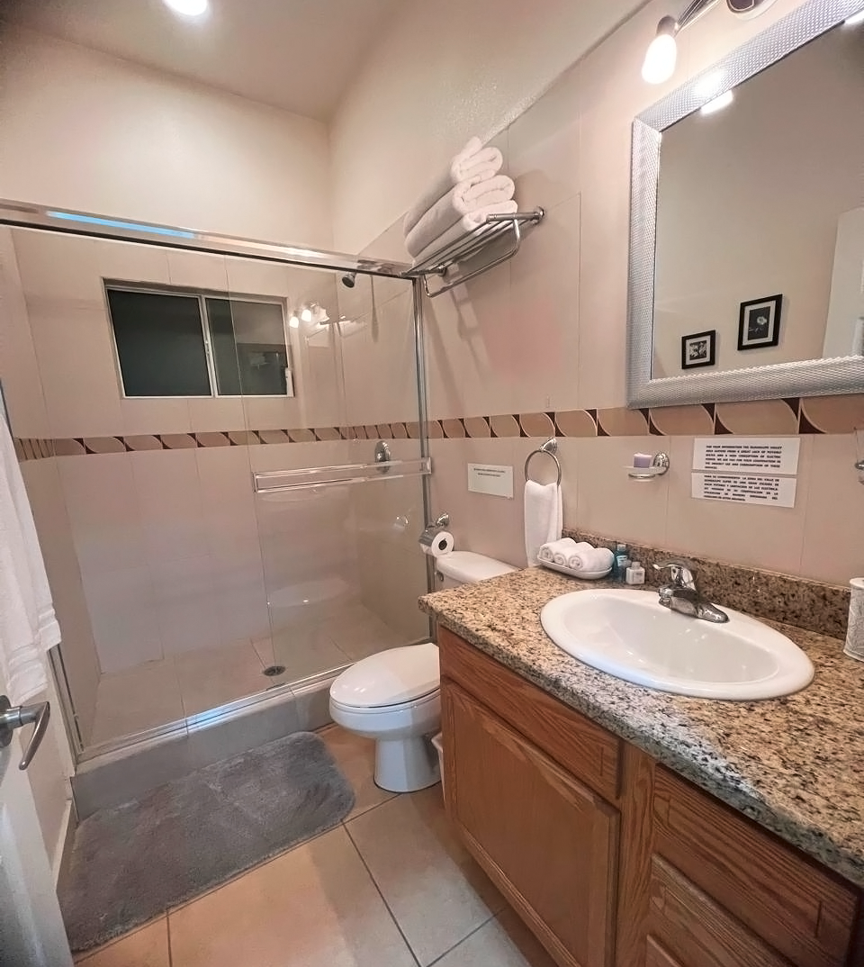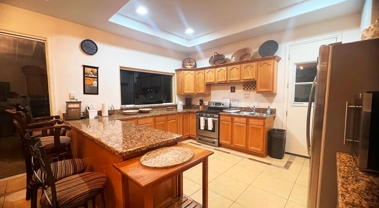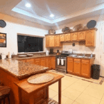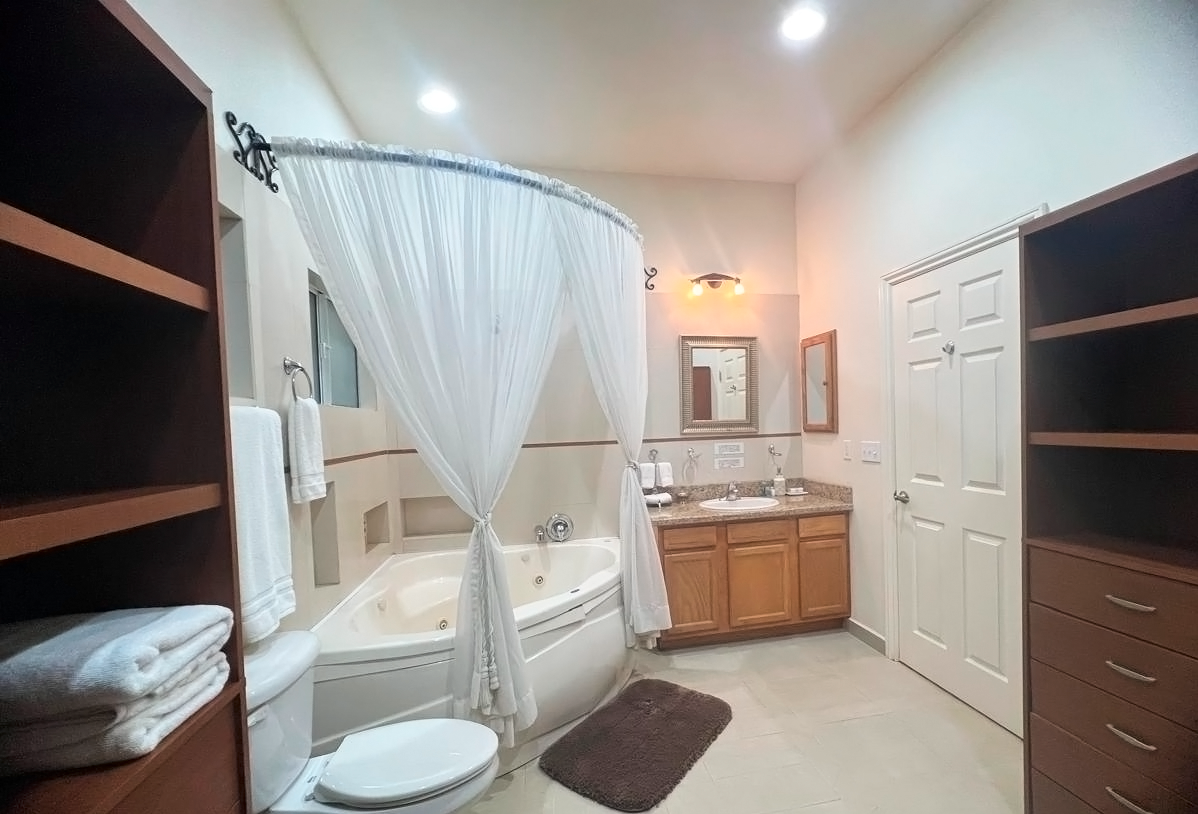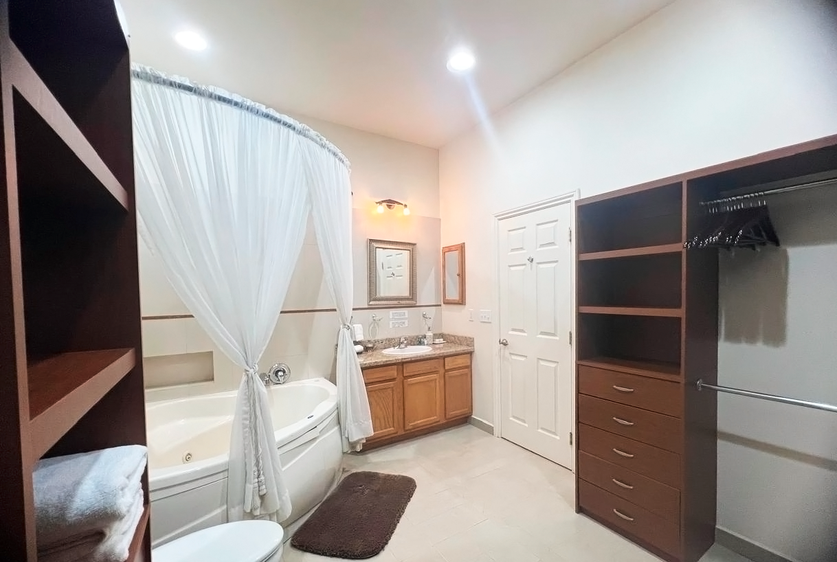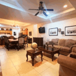 The common area includes a large living room with a bar and Sky TV, a dining room for 8 to 10 people and a spacious kitchen with wooden cabinets and granite bar. The laundry room has a washing machine, dryer and linen rack, for guests’ convenience.