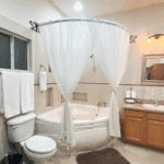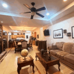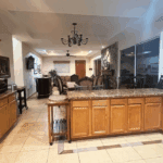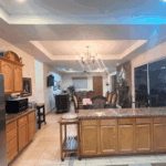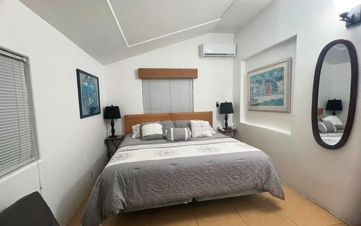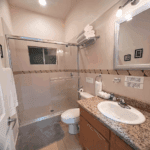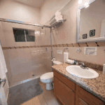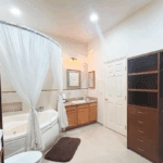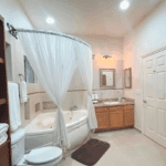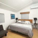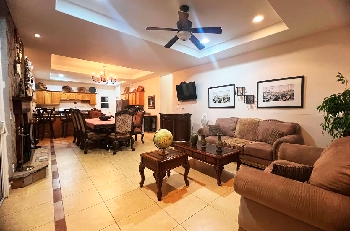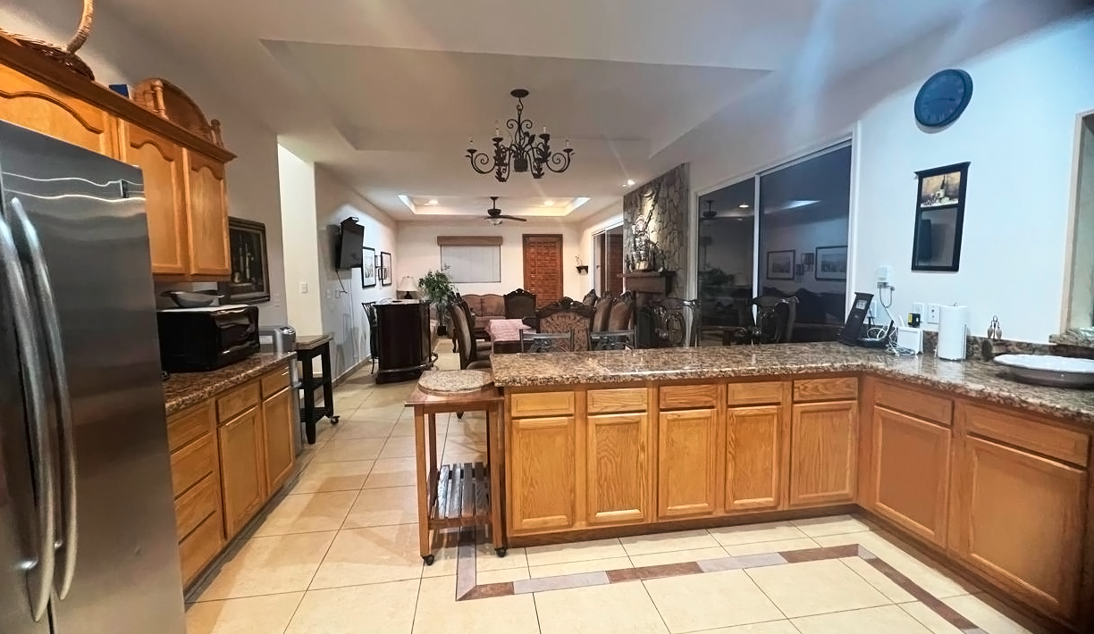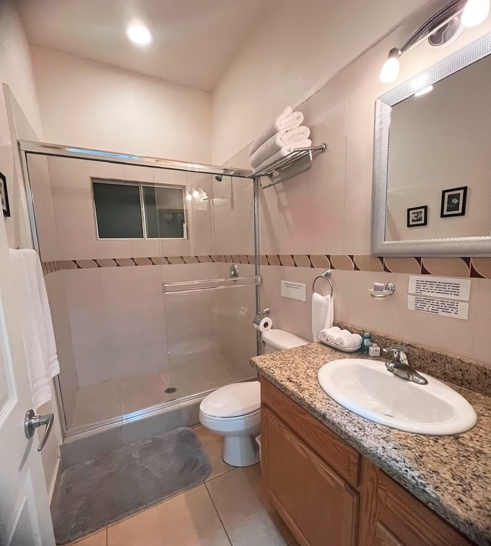 The common area includes a large living room with a bar and Sky TV, a dining room for 8 to 10 people and a spacious kitchen with wooden cabinets and granite bar. The laundry room has a washing machine, dryer and linen rack, for guests’ convenience.