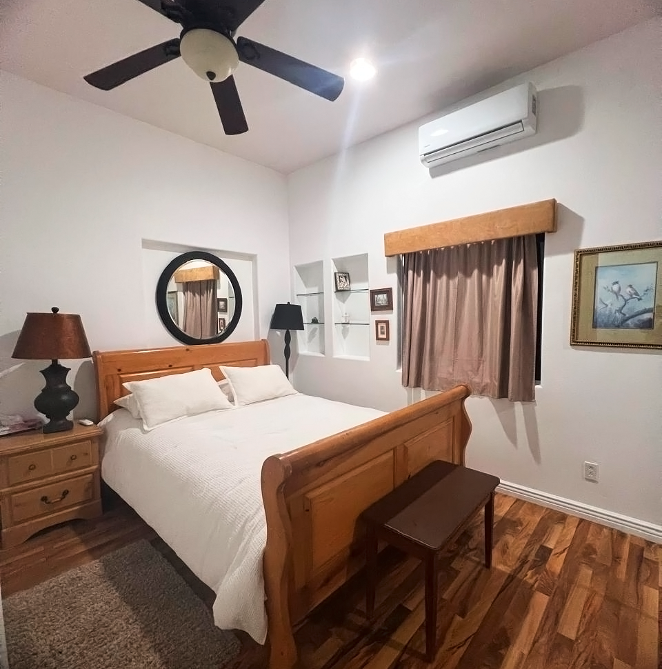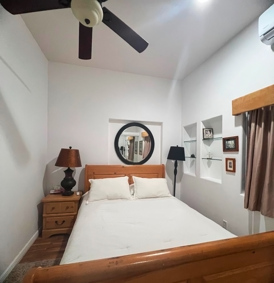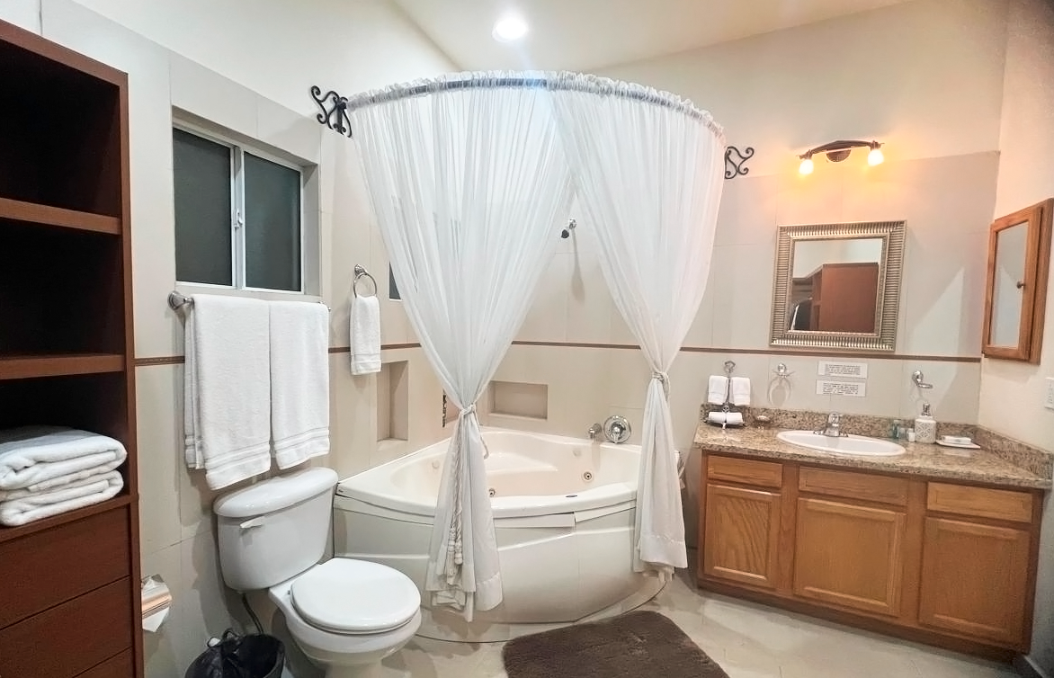The master bedroom is an oasis of serenity, equipped with a luxurious King size bed, air conditioning with heating, ceiling fan, large closet, bathroom with Jacuzzi, Sky TV and a private terrace with spectacular views. The second room has a King size bed, air conditioning with heating, ceiling fan, closet and full bathroom. The third bedroom offers a double bed, air conditioning with heating, ceiling fan, closet and Sky TV. The fourth room is equipped with two single beds, wardrobe and standing fan. A full bathroom is available for the use of the third and fourth bedrooms.